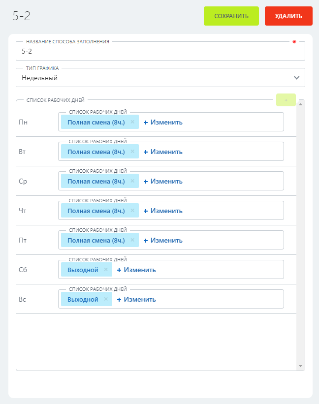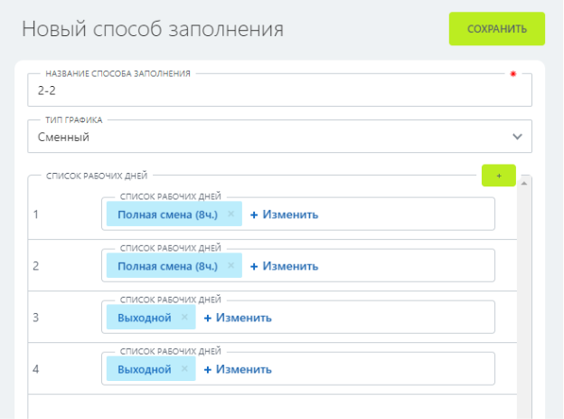 Для добавления способа заполнения необходимо указать его название, а также список рабочих дней в одном способе заполнения. Для каждого дня можно настроить одну из существующих смен или выходной